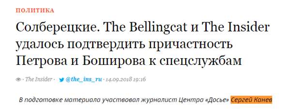 Самое забавное заключается в том, что именно беглый журналист послужил распространению фейковой статьи Bellingcat и Insider, где опытные журналисты-фейкометы якобы подтвердили факт того, что Боширов и Петров работали на несуществующее ныне ГРУ.