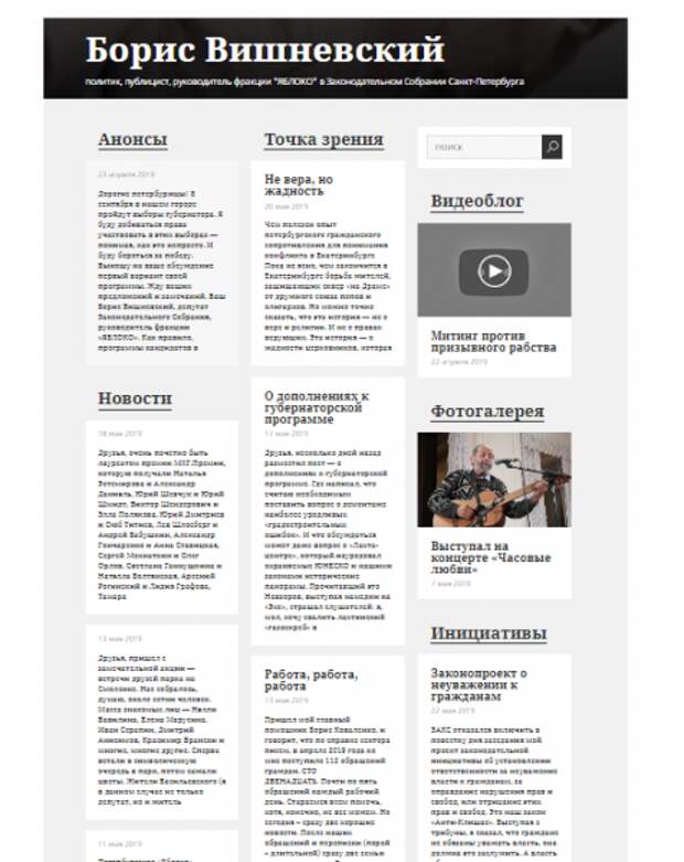 Вот только Вишневский не предлагает ничего конкретного, кроме «выстраивания вертикали власти». Интересно, чем его не устраивает нынешняя? Несмотря на приглашение либерста заглянуть к нему на сайт, чтобы ознакомится с предвыборной программой, сделать это фактически невозможно. Сам сайт набит дешевыми статьями про то, какой Вишневский хороший, но самой программы, конечно, нет.